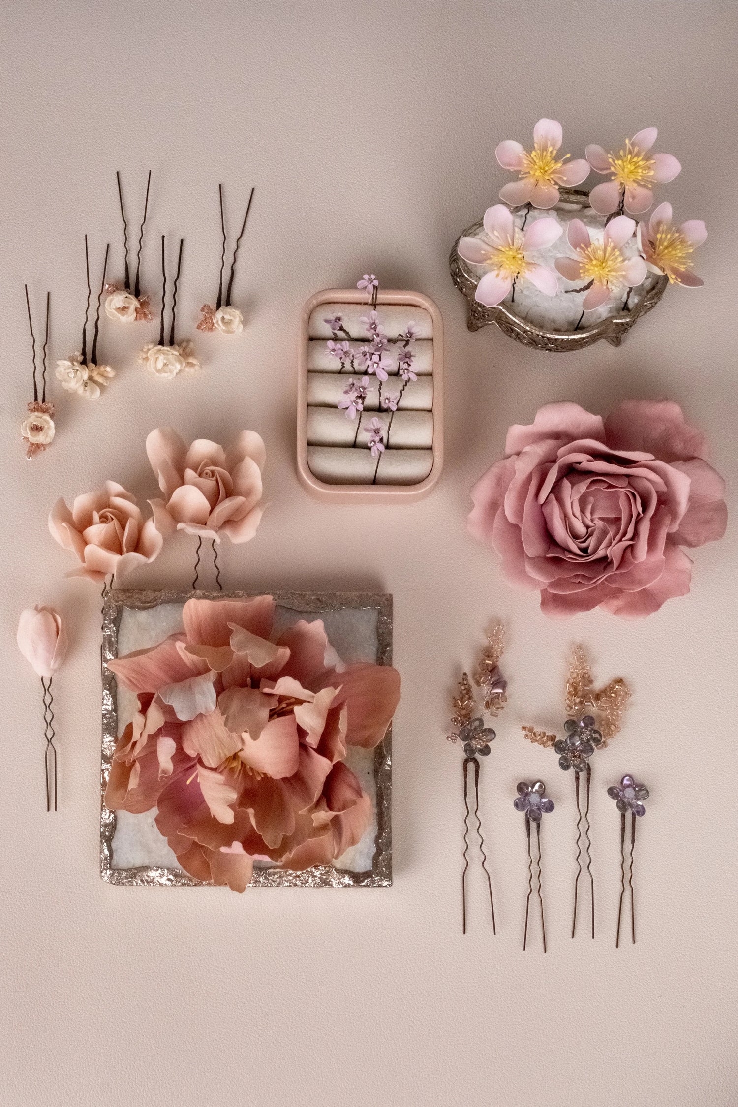 Popular set of hair pins with tiny ivory flowers. Ideal for an Updo, Half-Up Half-Down and other elegant wedding hairstyles.