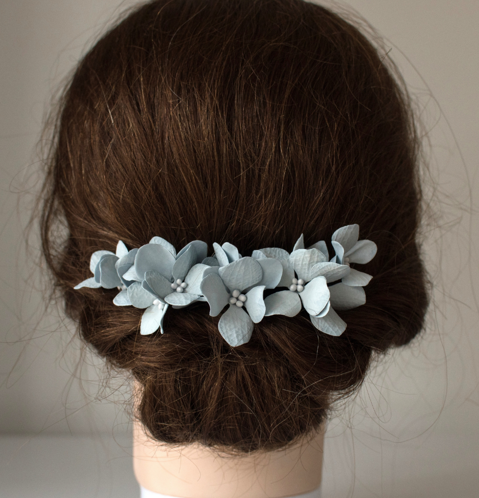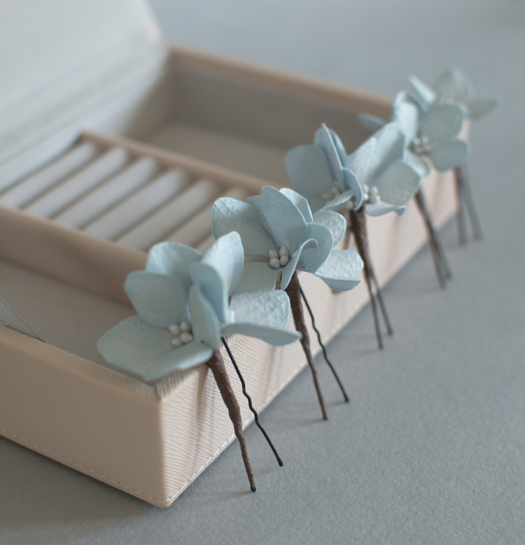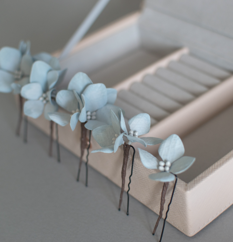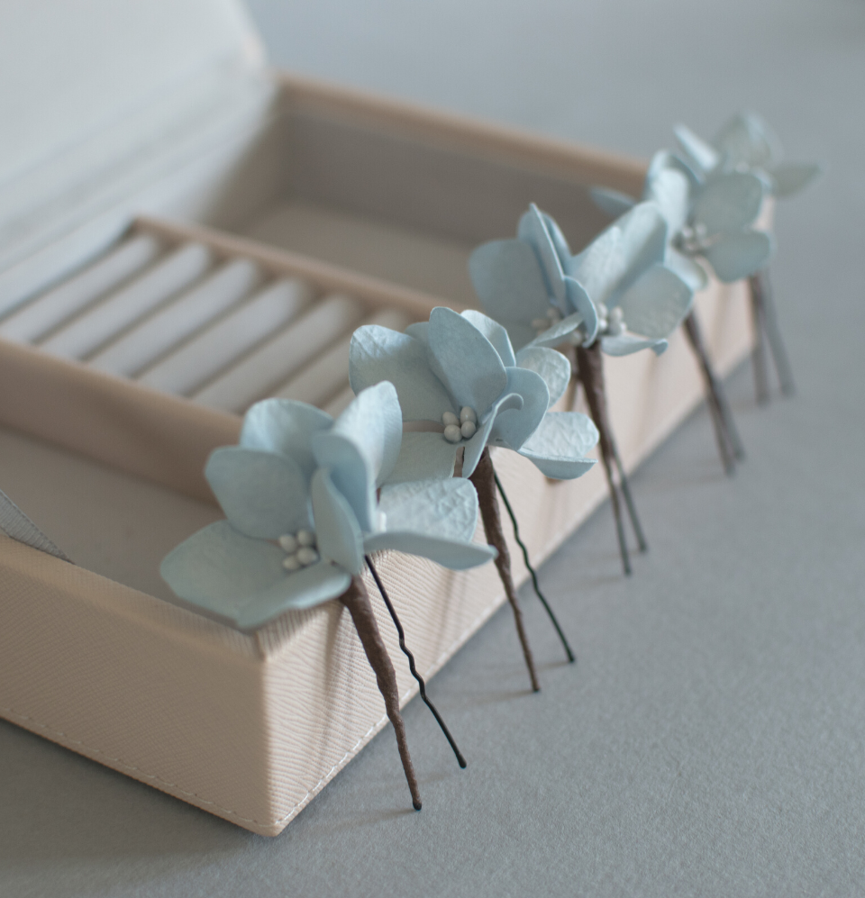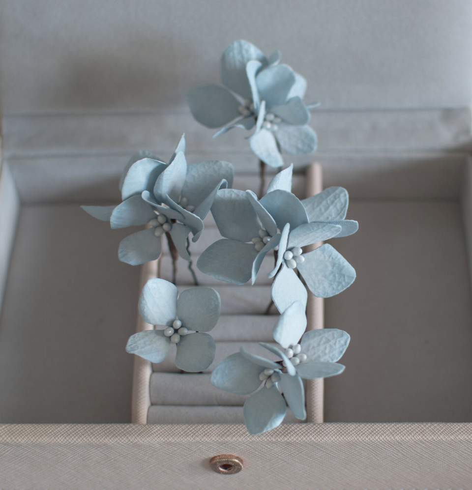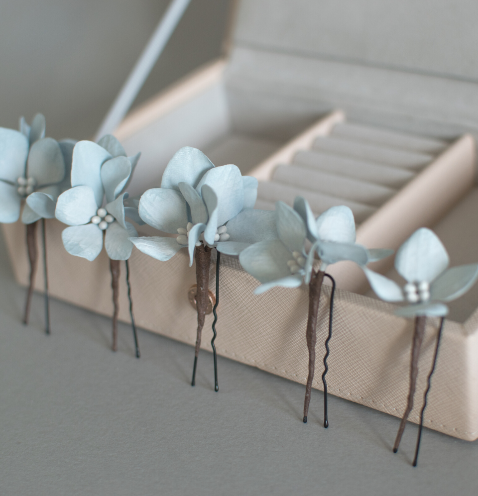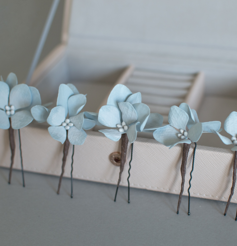 This gorgeous set for a wedding hairstyle consists of 5 bespoke hydrangea flower hair pins in baby blue colour.