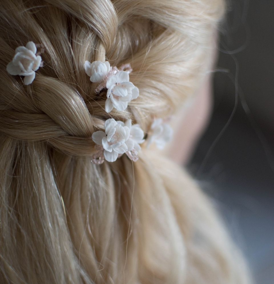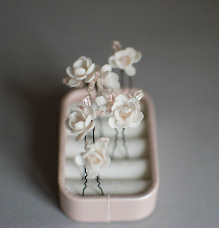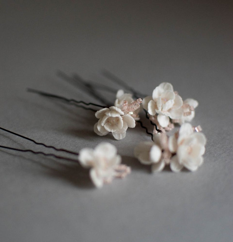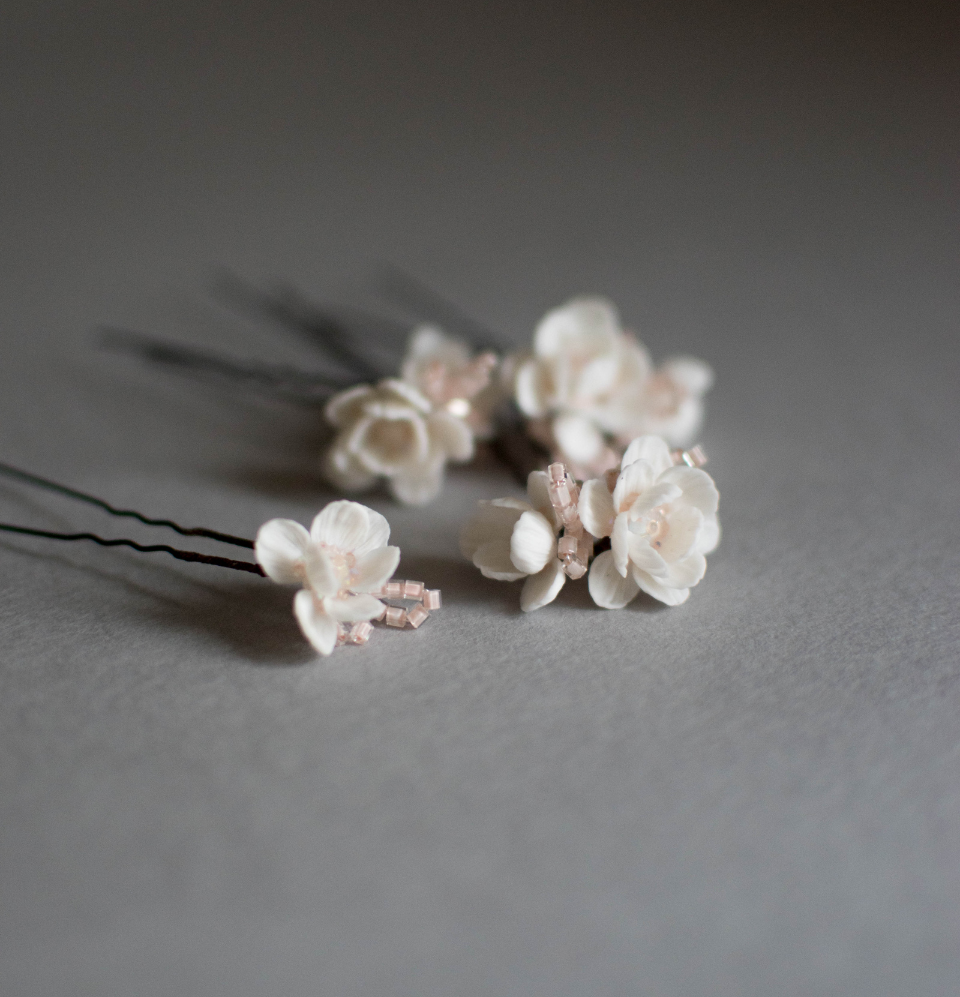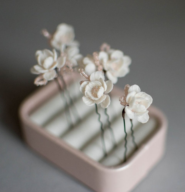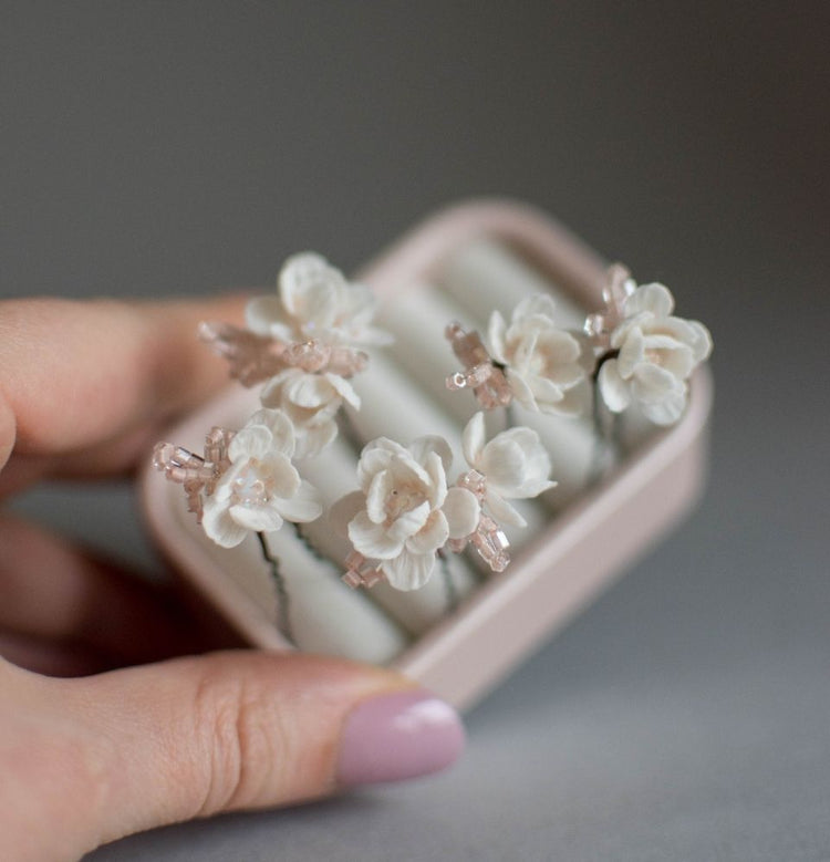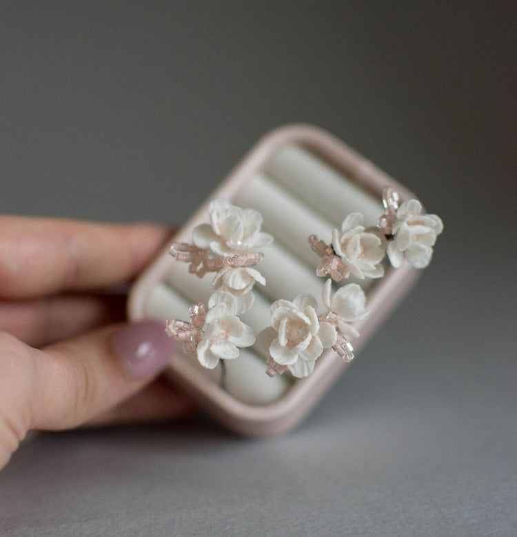This set of tiny ivory-pink colors bridal flowers hair pins is perfect for a wedding.