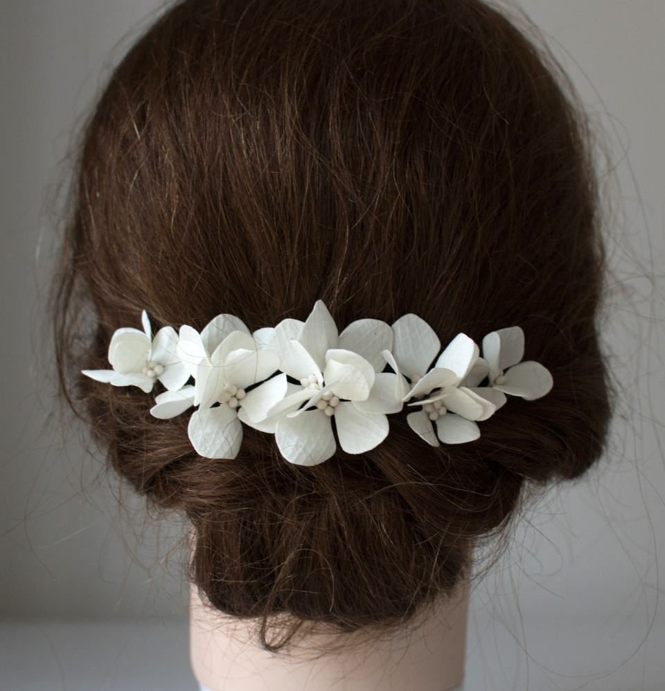 This hydrangea looks and feels realistic. Each flower and detail is handcrafted. The long pins make them secure in your hair.