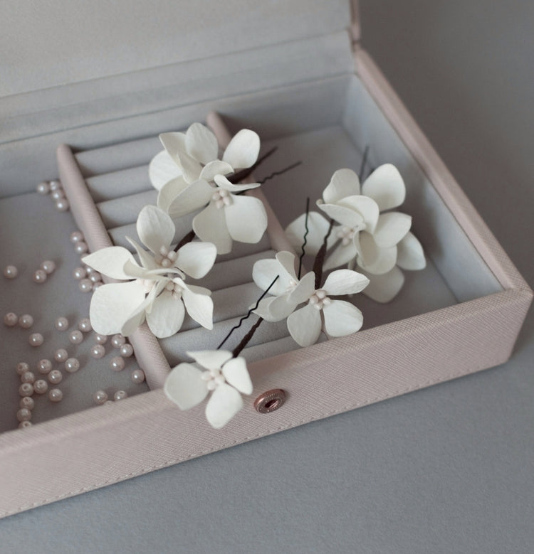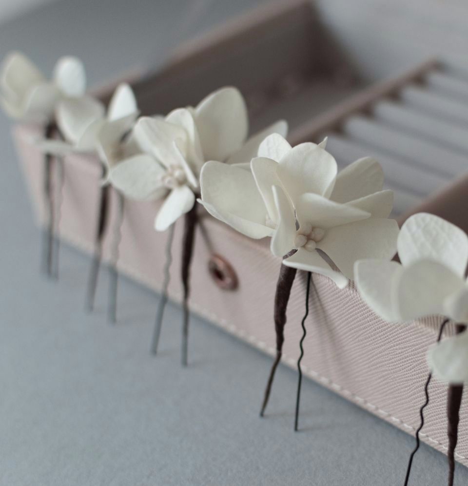 This gorgeous set for a wedding hairstyle consists of 5 handmade hydrangea flower hair pins in Ivory colour.