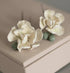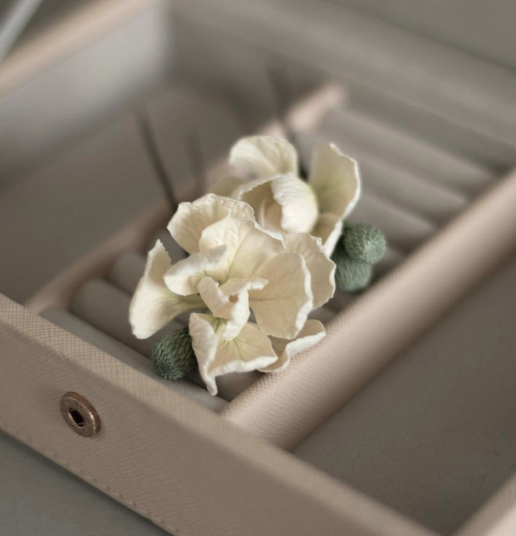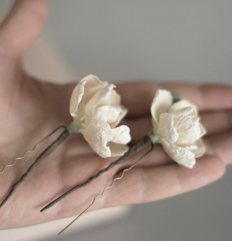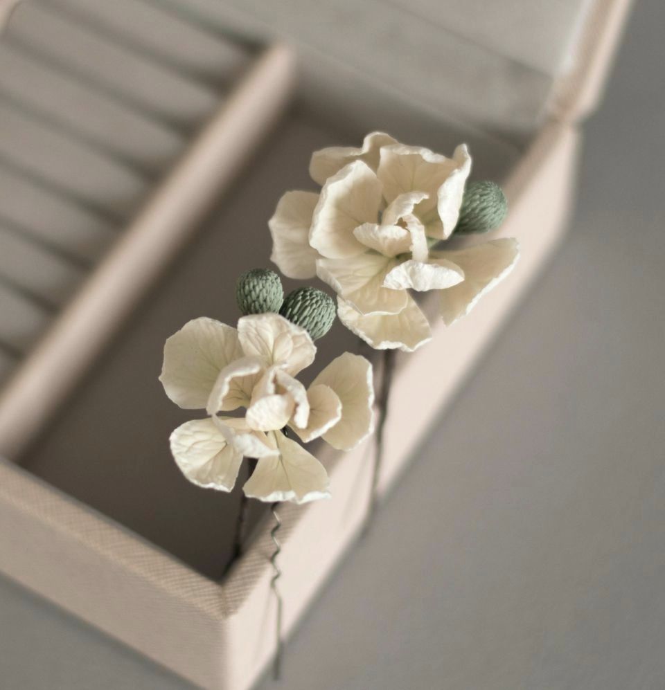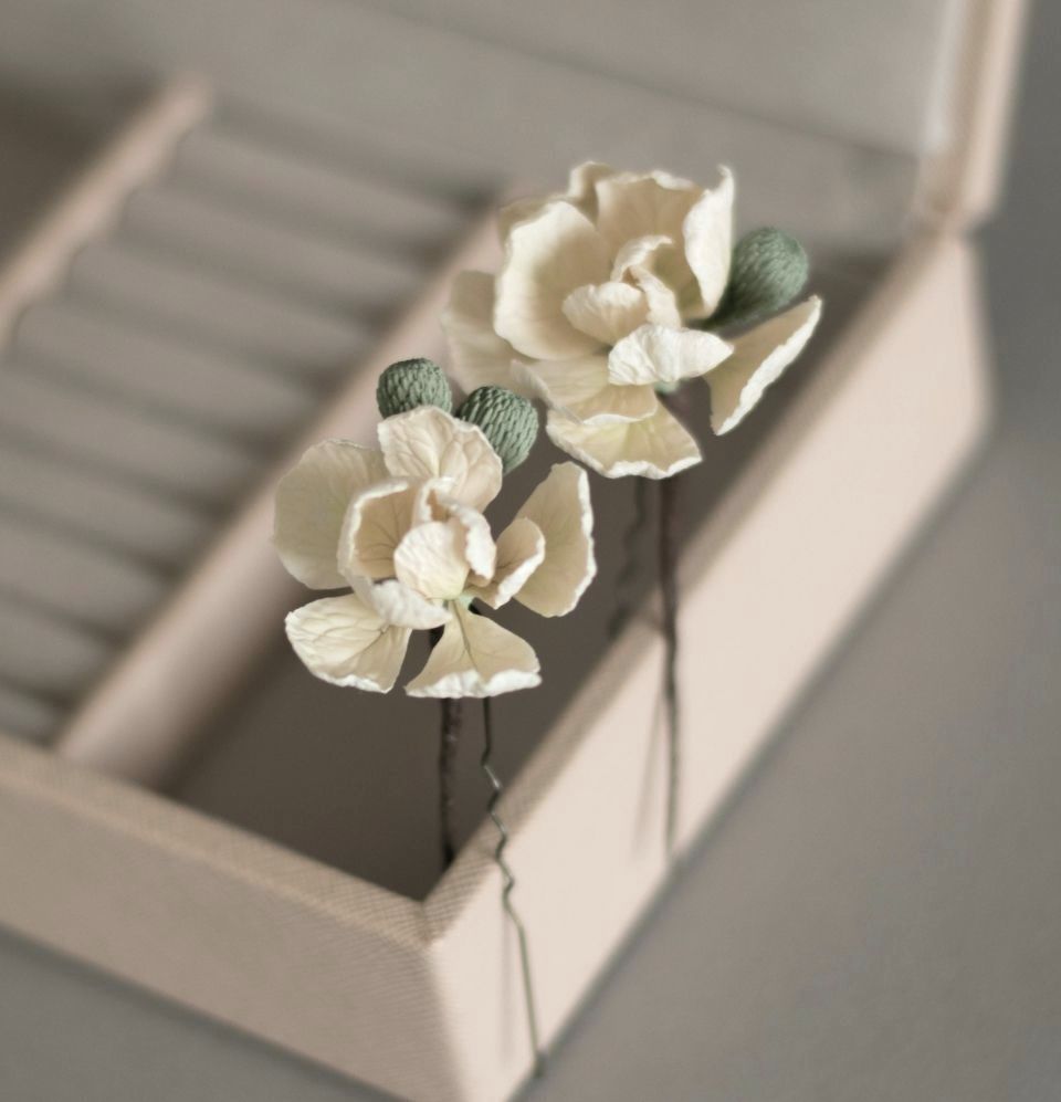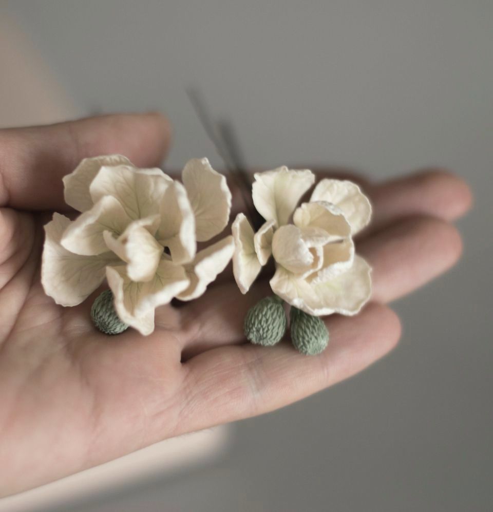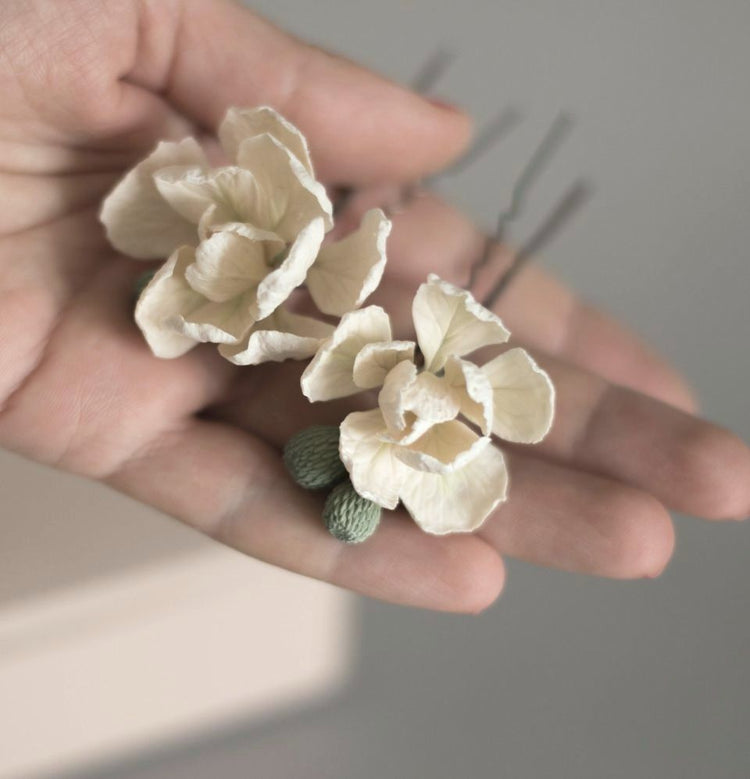 These exquisite hairpins are entirely handcrafted from polymer clay, featuring delicate ivory flowers and berries. A truly unique piece to adorn your special day.