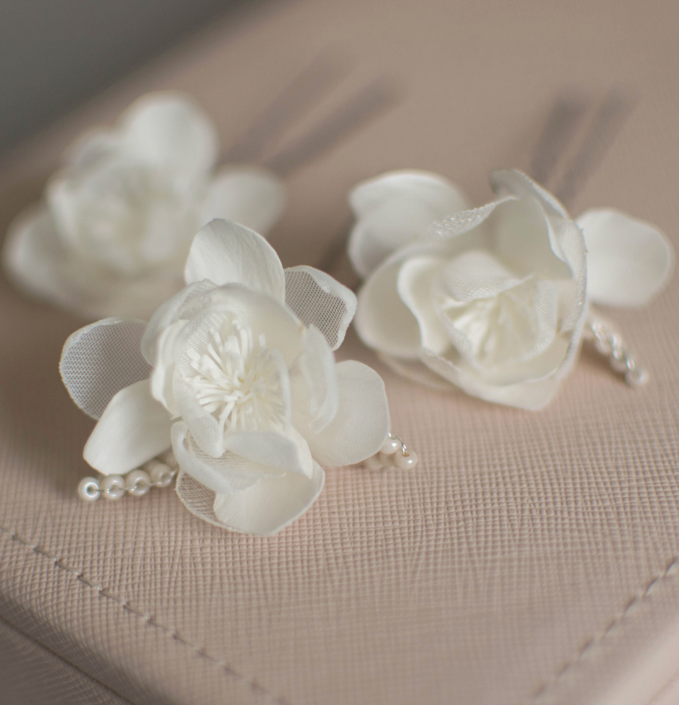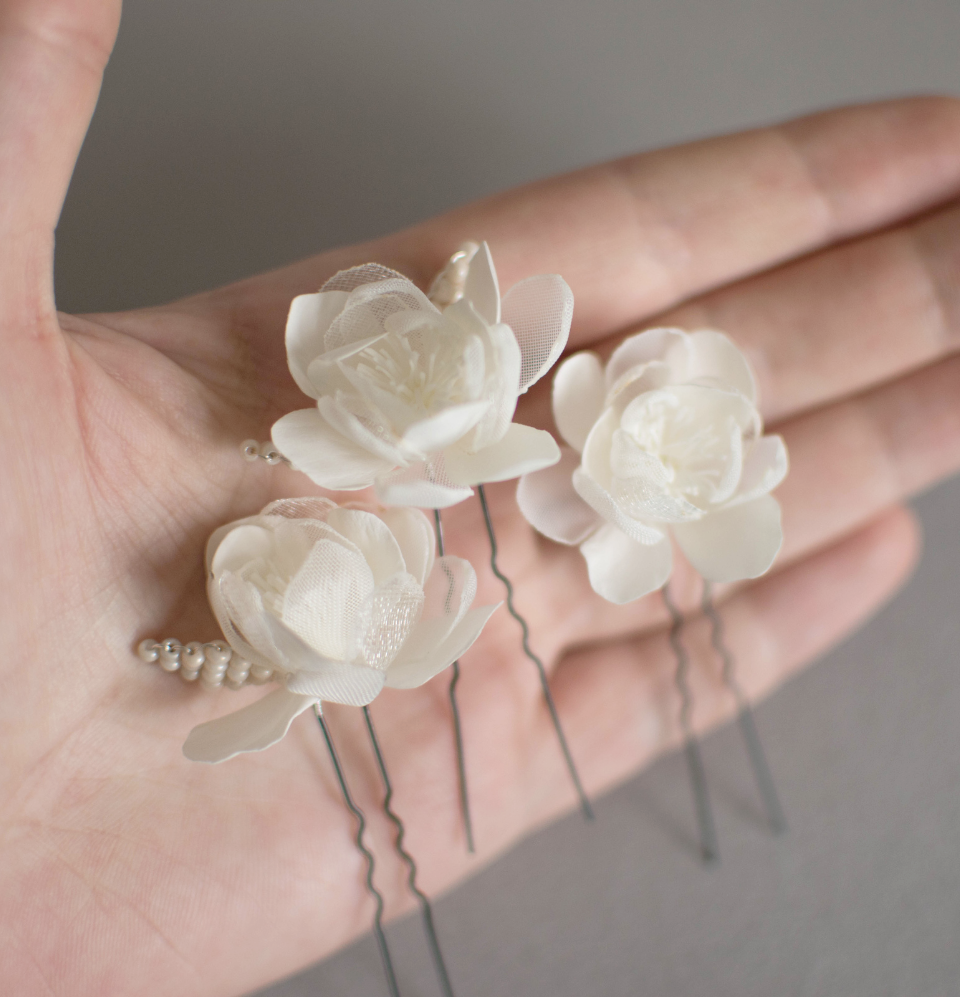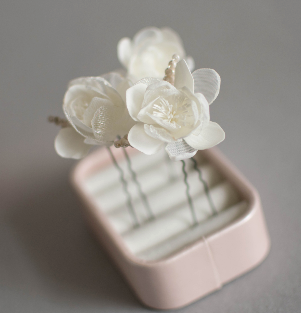 Ivory wedding flowers on hair pins
