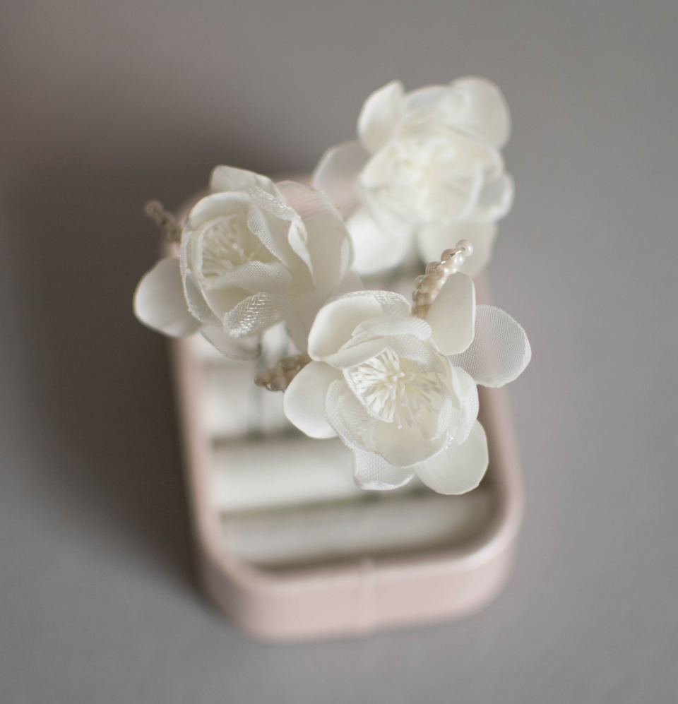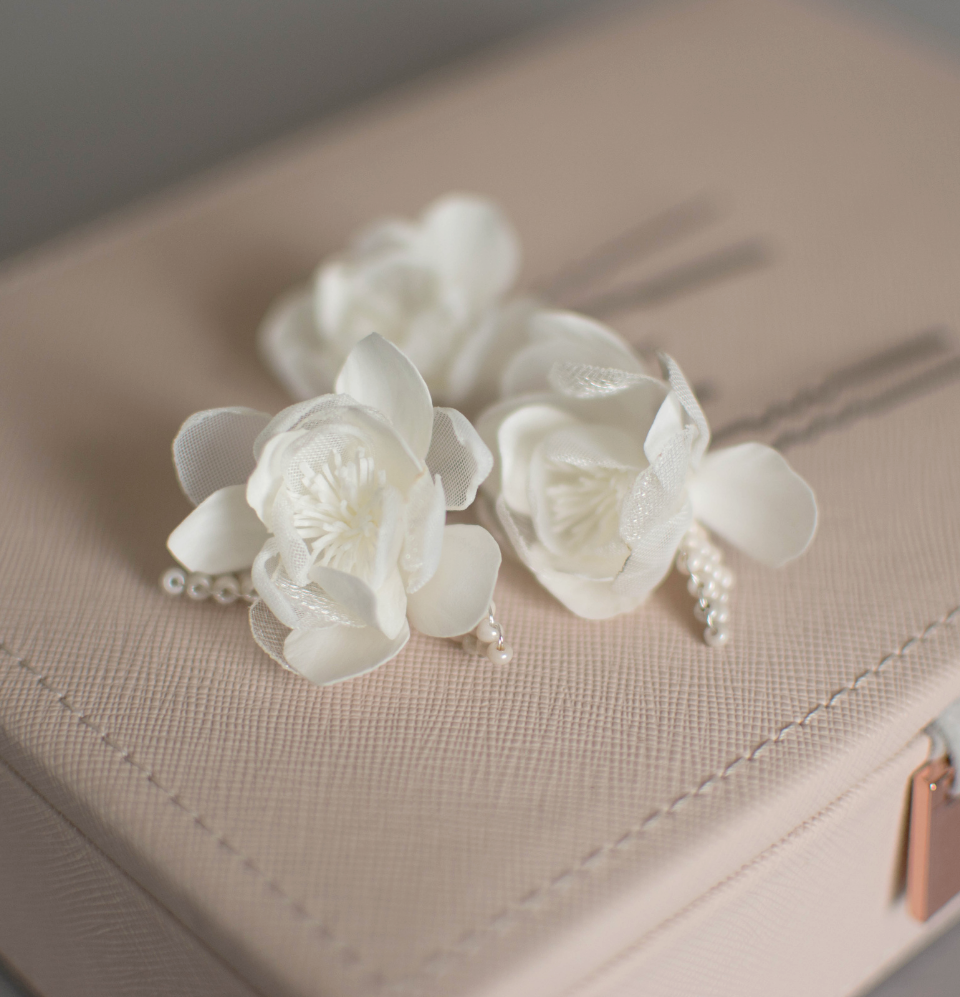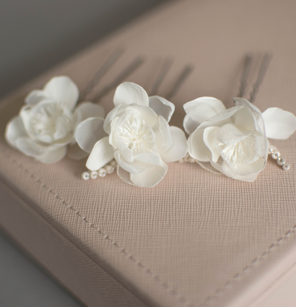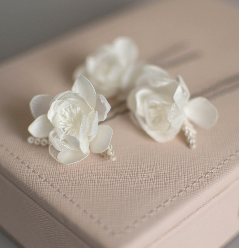 Ivory wedding flowers on hair pins