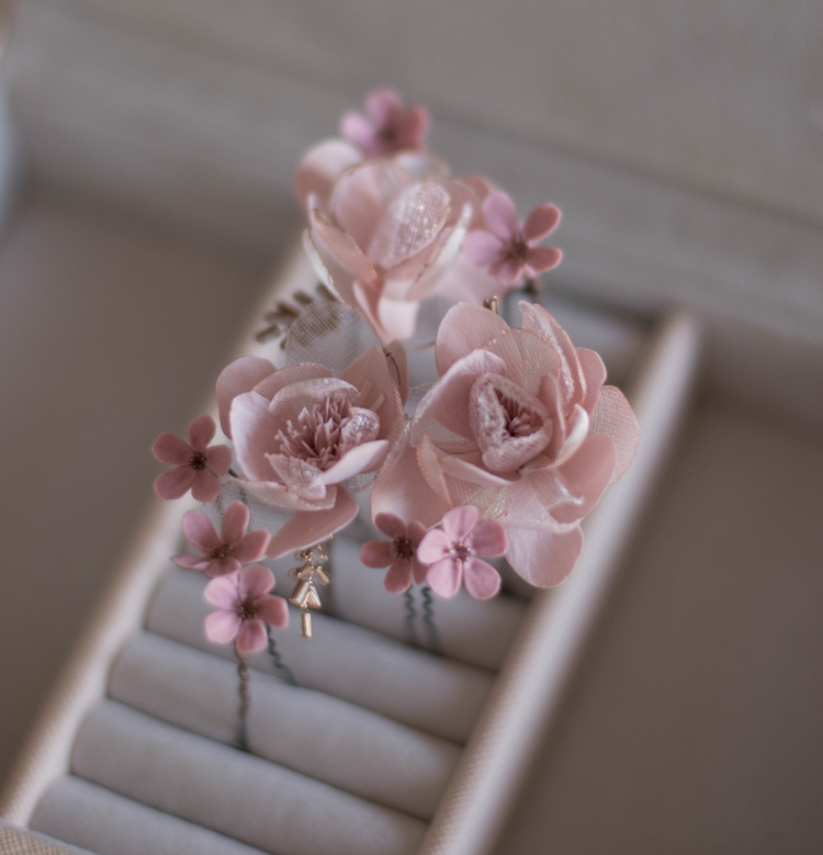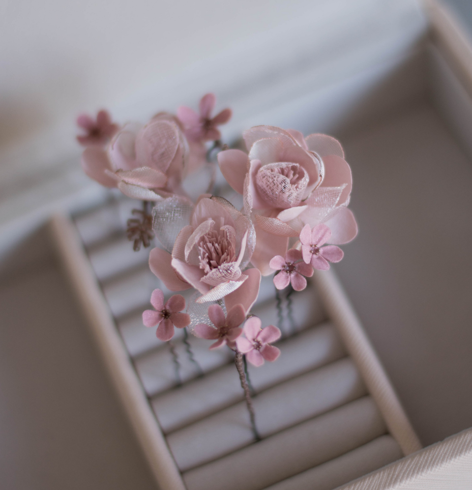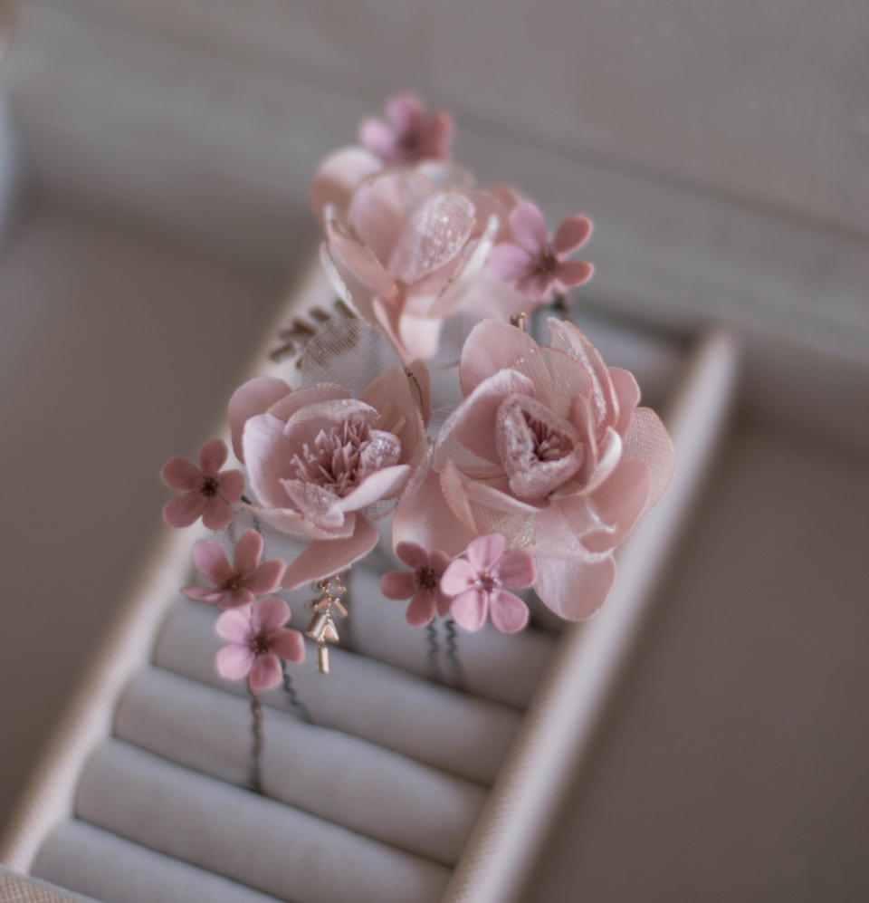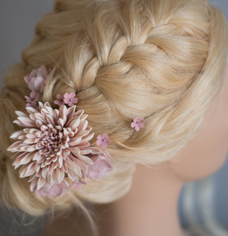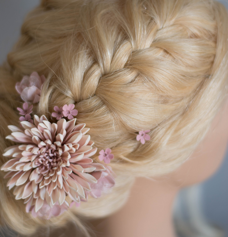 This set consists of 3 blush-pink flowers from foam and organza with bugle elements + tiny powdery pink polymer clay flowers on hair pins + medium white-pink chrysanthemum.