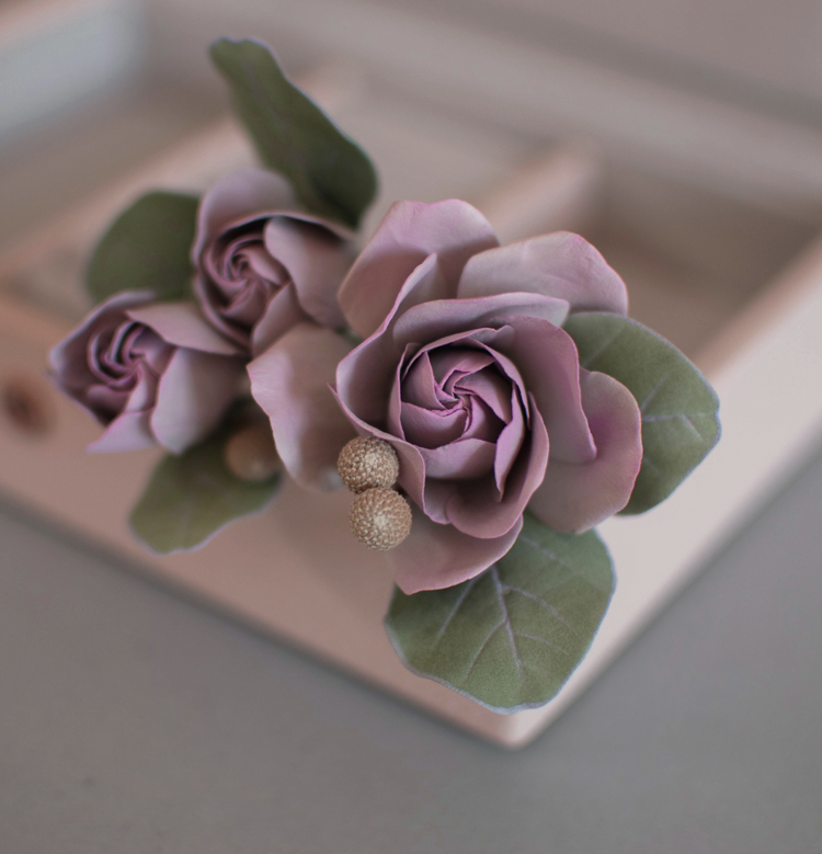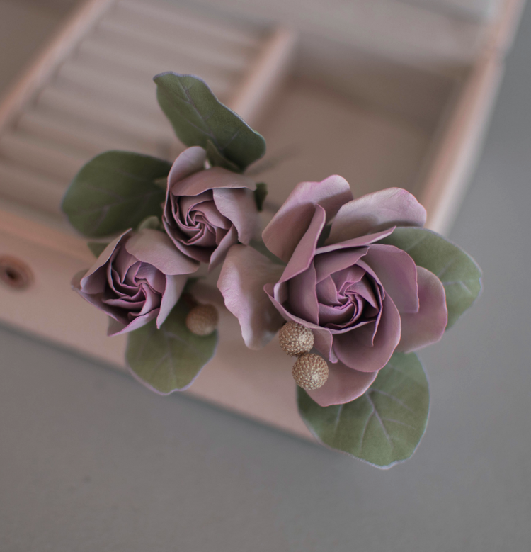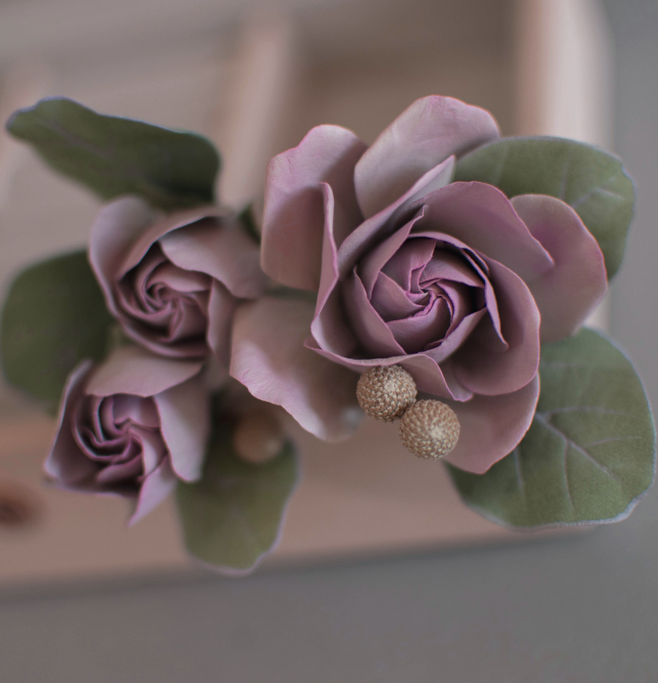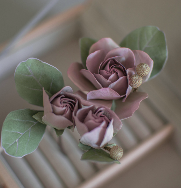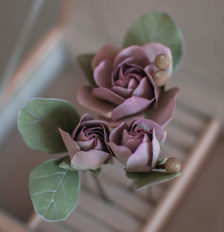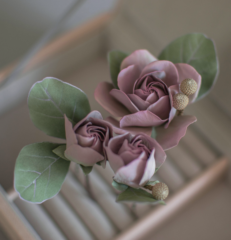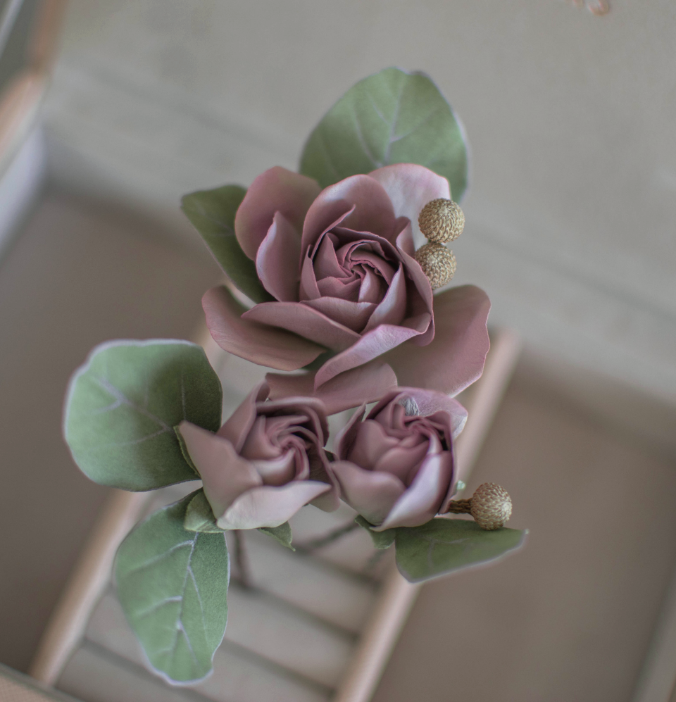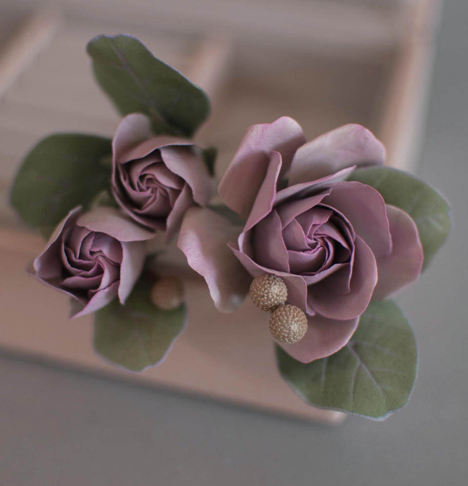 All flower elements are handmade from foam or polymer clay. Original design and unique technique by Nadya Mamaeva (DECOFLOWERS). In addition, we supplement our items with organza, natural silk, Japanese beads, Swarovski crystals, freshwater pearls, non-tarnish jewellery wire and many other high-quality materials. All rights reserved.