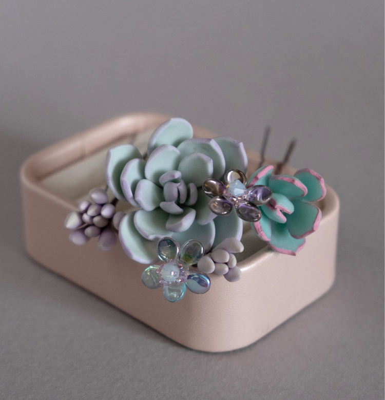 Keep away from fire and heat. Store in a storage box, separate from other heavy jewellery. Protect from large amounts of water - do not wear under tropical rain and do not swim (for polymer clay). A product with delicate details is fragile; wear it with care. When fixing the product on the hairstyle, do not press on thin parts.