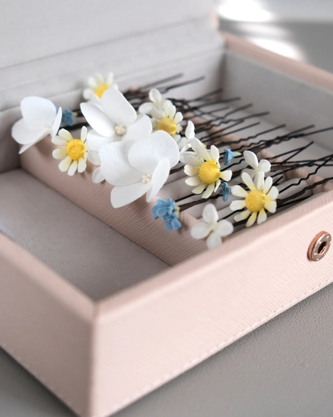 Bring the beauty of wildflowers to your summer look with our Summer Meadow set – a dreamy collection of delicate hair pins, each sculpted by hand from lightweight foam and polymer clay.