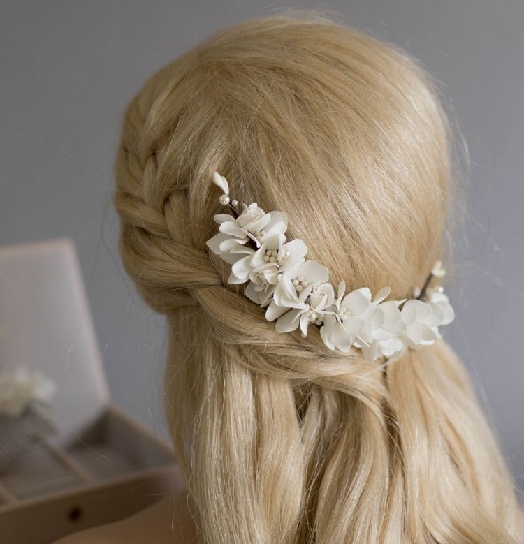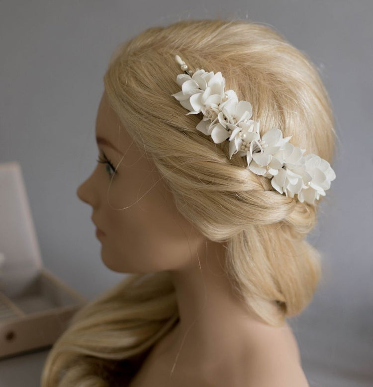 This flower hair comb is created by hand from handmade foam hydrangea and decorated with pearls and miniature polymer clay roses. The flower's petals have a soft luxurious feel.