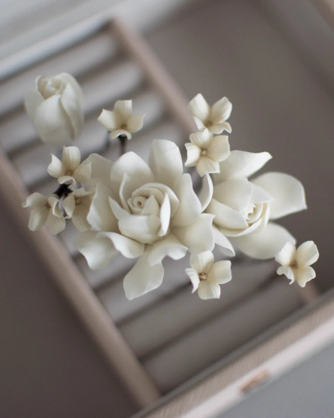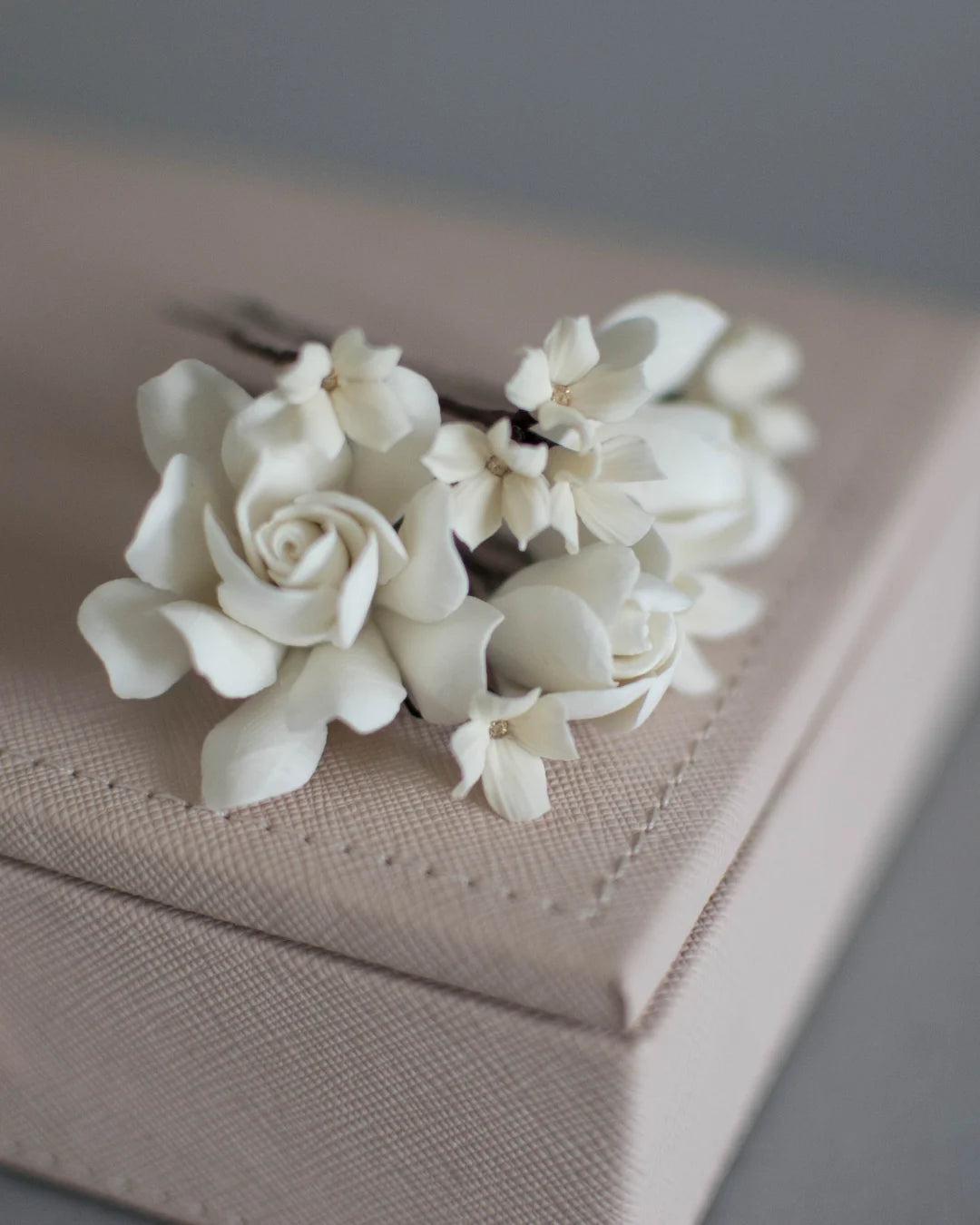 A refined floral set designed for brides who love understated elegance. This handcrafted set includes 3 ivory mini gardenias and 5 tiny flower hair pins, perfect for romantic updos and softly styled waves.