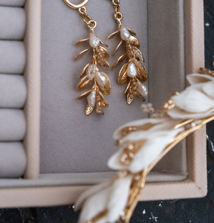 The earrings are made with a metal base and have a secure clasp, ensuring they stay in place. They are beautifully decorated with vintage baroque pearls, adding a timeless charm to the set.