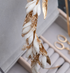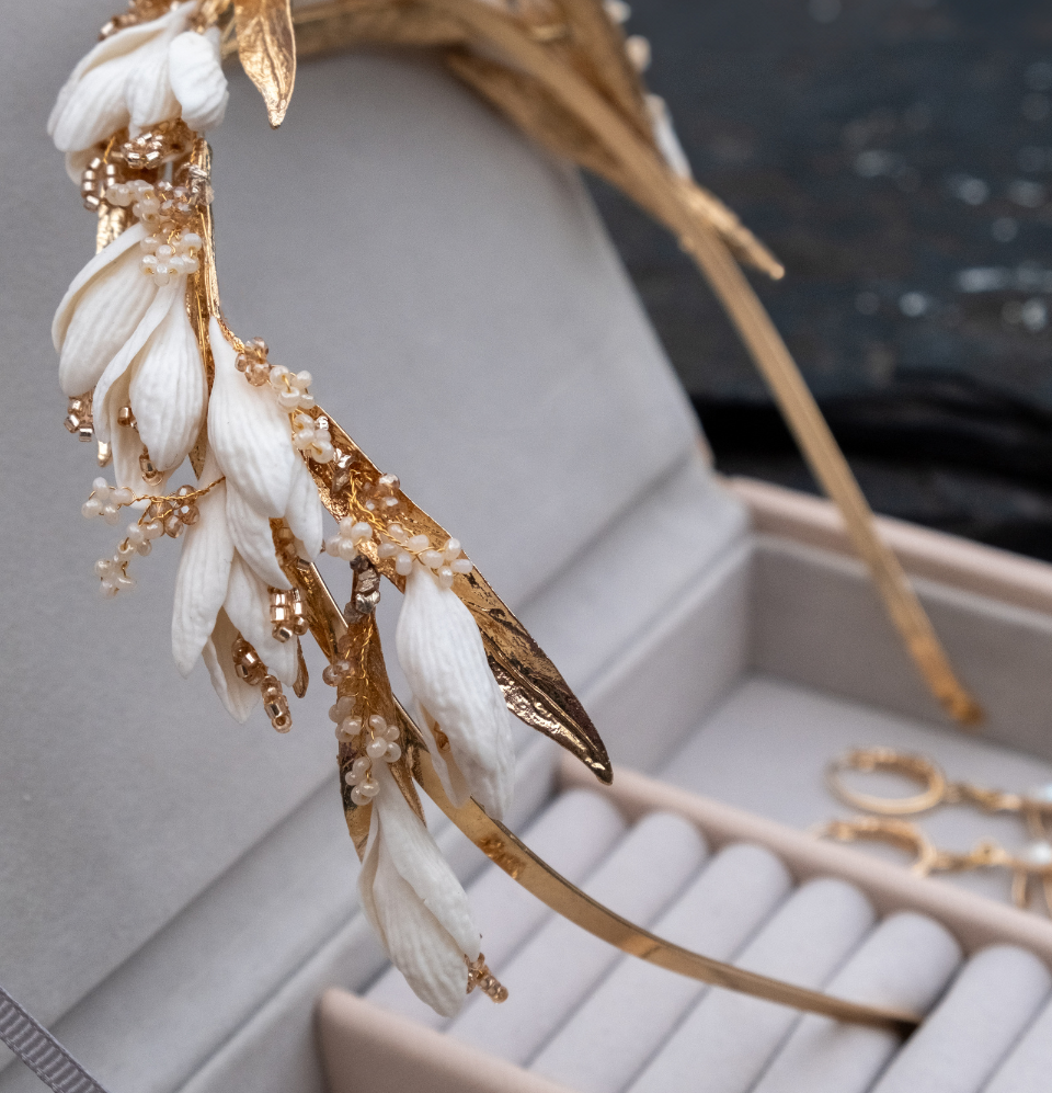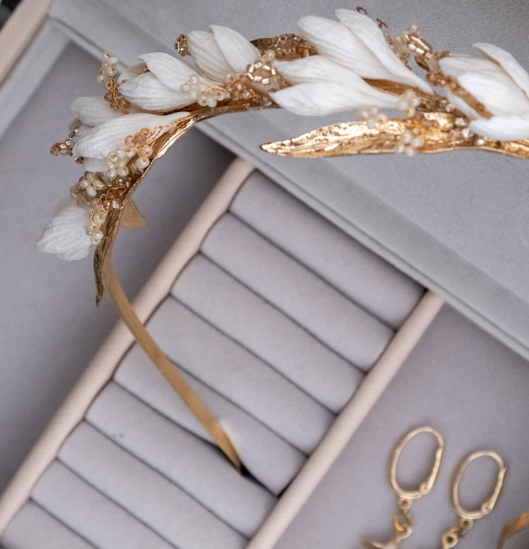 This elegant tiara and earrings set is perfect for adding a touch of sophistication to any outfit. The tiara features a sturdy metal base adorned with delicate golden leaves, complemented by handmade teardrop-shaped flowers crafted from polymer clay. Each flower is centered with sparkling beads, adding a touch of glamour. Interspersed between the flowers and leaves are vintage bead branches, enhancing the overall intricate design.