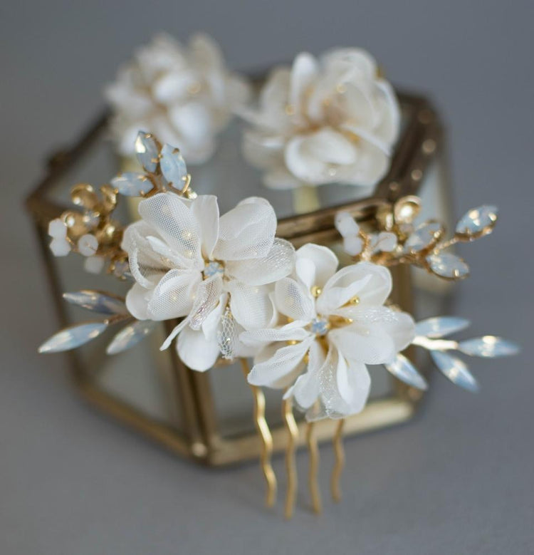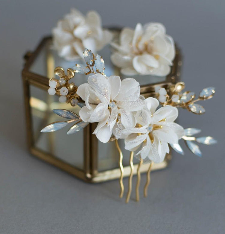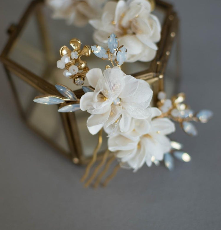 Palette: A romantic combination of Ivory, gold, and white opal shades.